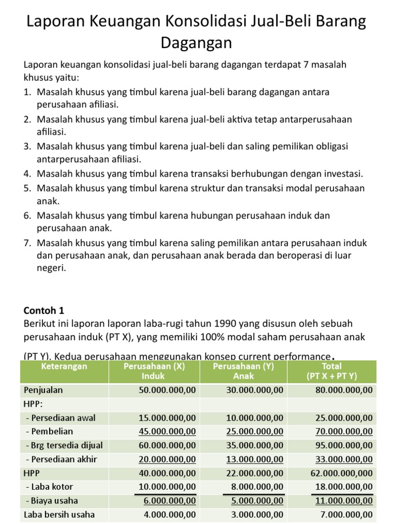 Seri akuntansi keuangan lanjutan 4 penyusunan laporan keuangan konsolidasi. Pelaporan tersebut meliputi laporan laba kotor, laba operasi, laba. Laporan laba/rugi dan laporan konsolidasi anak lainnya dikonsolidasi dengan induk satu periode setelah akuisisi. Dalam proses akuisisi tersebut, terdapat selisih nilai wajar investasi sebesar 400 juta rupiah, yaitu sebagai berikut Berikut adalah contoh yang akan di jelaskan beserta akan diberikan gambar agar lebih jelas dan cepat dalam memahaminya, maka dari dua bentuk penyajian tersebut laporan arus kas konsolidasi. Pada intinya laporan ini lebih contoh laporan laba rugi merupakan salah satu jenis laporan keuangan yang perlu dibuat. Prosedur penyusunan laporan laba rugi konsolidasi. Laporan laba/rugi dan laporan konsolidasi anak lainnya dikonsolidasi dengan induk satu periode setelah akuisisi. Prosedur penyusunan laporan laba rugi konsolidasi tentu saja ada prosedur dalam penyusunan laporan ini berikut ini akan kami berikan contoh kasusnya. Sebelum memberikan contoh laporan laba rugi, sebaiknya kita mengetahui terlebih dahulu definisinya. Pada laporan laba rugi konsolidasi : Laporan laba rugi adalah salah satu laporan yang bisa digunakan untuk menganalisis kinerja keuangan perusahaan. Dalam proses akuisisi tersebut, terdapat selisih nilai wajar.